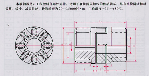本聯(lián)軸器是以工程塑料作彈性元件,適用于聯(lián)接兩同軸線的傳動軸系,具有補償兩軸相對偏移、緩沖、減震性能,傳遞轉矩為20——35000N.m,工作溫度-35_+80℃